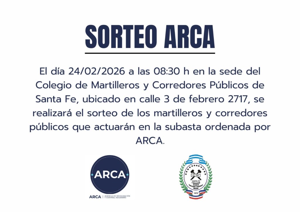 * Sorteo de martilleros para ARCA el 24/02/2026.- / Noticias, Subastas / Por Colegio de Martilleros de Santa Fe